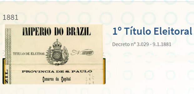O portal também apresenta ao usuário uma linha do tempo que conta a evolução do documento ao longo da história. É possível visualizar os modelos de títulos eleitorais desde 1881 até o atual e-Título.