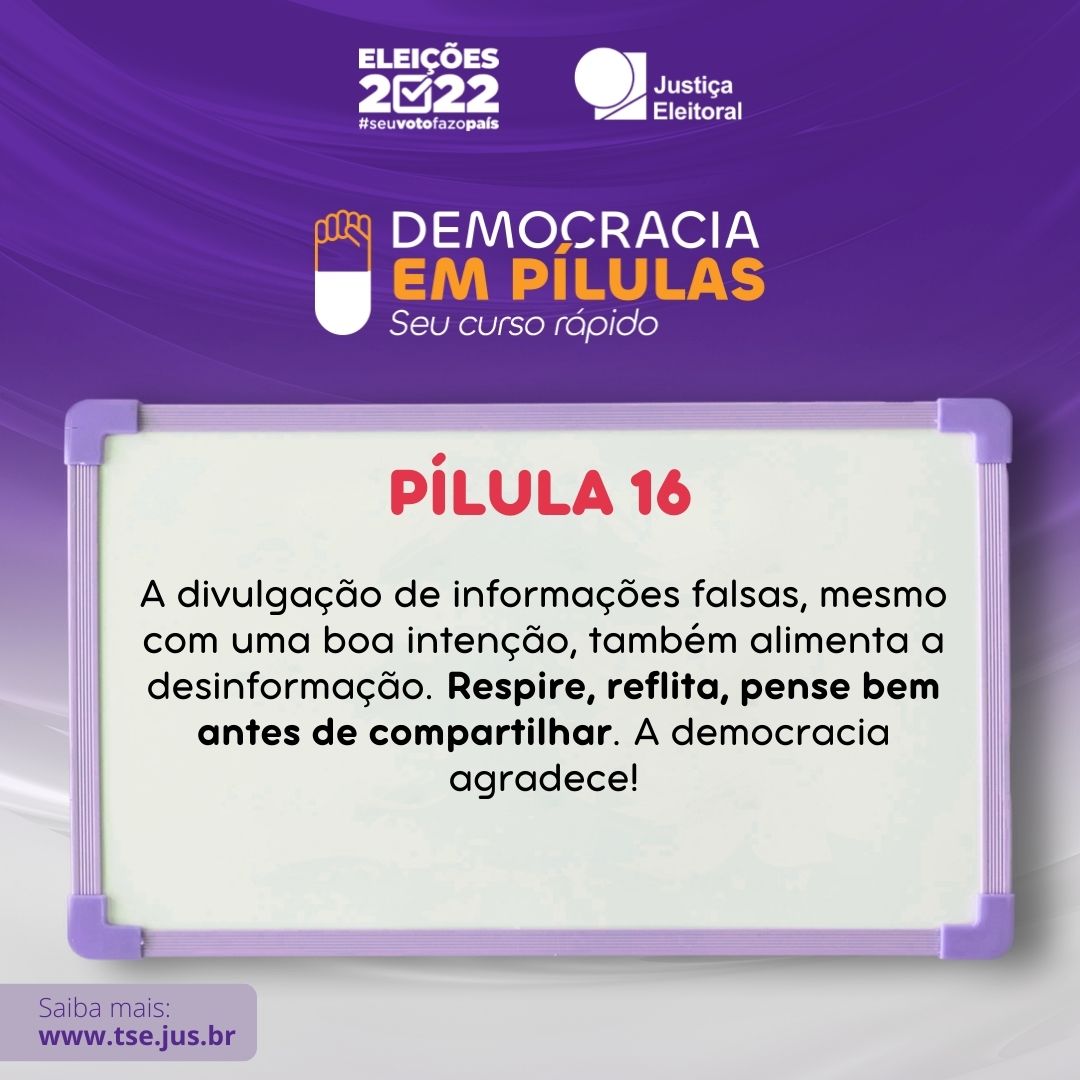 Esse é o 16º texto da série #DemocraciaEmPílulas, que publica durante todos os dias deste mês de junho mensagens curtas nas redes sociais para reforçar a importância do combate à desinformação no processo eleitoral.