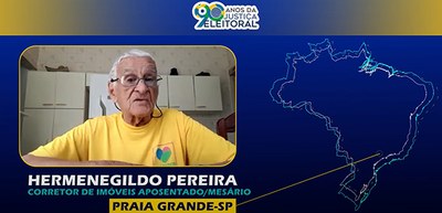 O corretor de imóveis aposentado Hermenegildo Pereira Neto, 92 anos, é natural do Ceará, mas mora em Praia Grande (SP). Ele começou a ser mesário em 1989, após receber convocação da Justiça Eleitoral. “A partir daí, eles nunca deixaram de me convocar e eu nunca deixei de atender”, afirma.