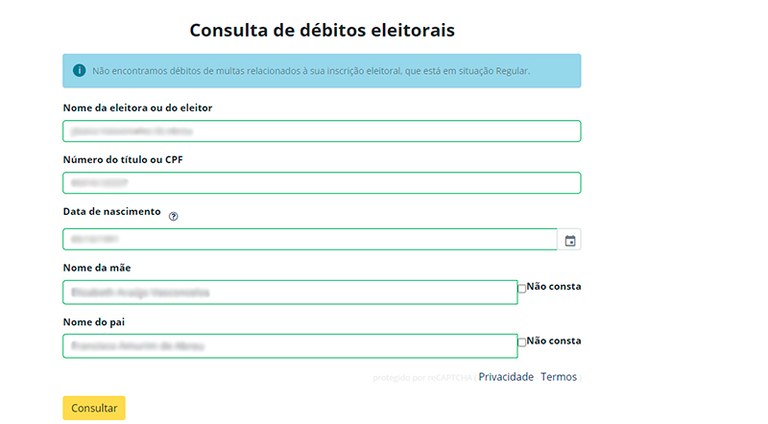 Caso não sejam encontradas multas, a página retornará a mensagem “Não encontramos débitos de multas relacionadas à sua inscrição eleitoral, que está em situação Regular”.