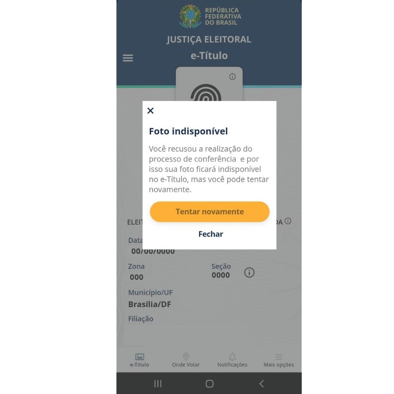 Caso você queira votar apresentando somente o e-Título, disponível nas plataformas iOS ou Android, é preciso que o aplicativo contenha a sua foto. Se você baixou o app e ele não mostra a sua fotografia, podem estar ocorrendo as seguintes situações:
